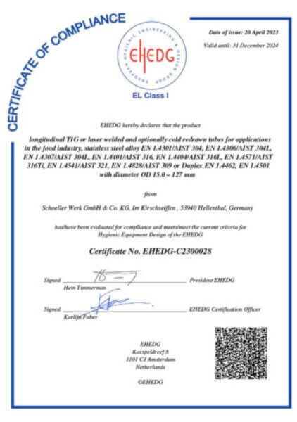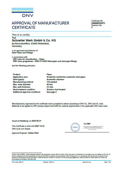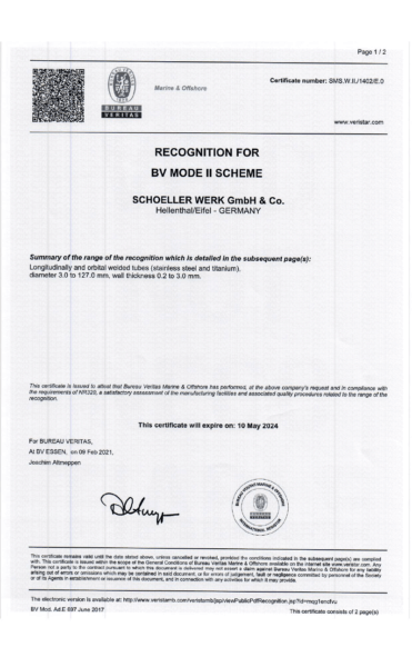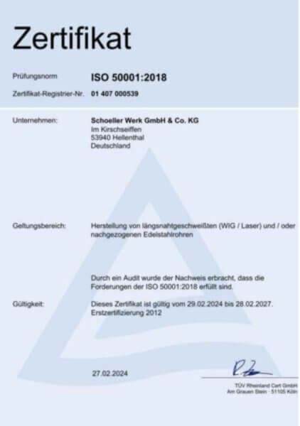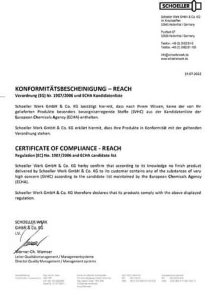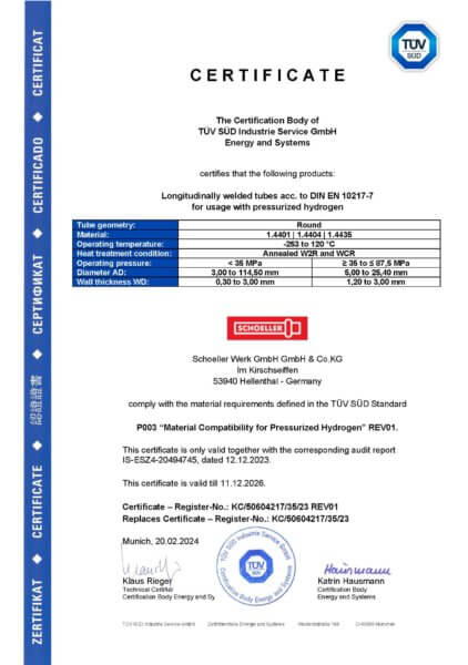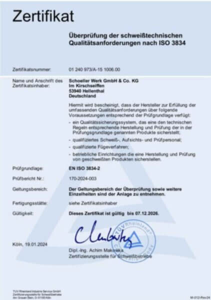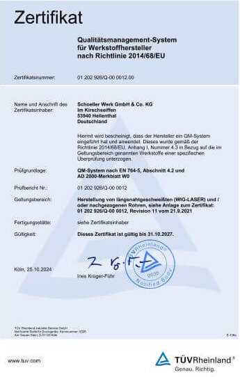 Garantire standard qualitativi elevati è uno dei principi fondamentali di Schoeller, che seguiamo lungo l’intero processo produttivo – dal nastro di partenza fino al prodotto finito. A tal fine, ci sottoponiamo regolarmente a verifiche da parte di enti di certificazione esterni e siamo certificati secondo IATF 16949:2016, Direttiva 2014/68/UE, ISO 9001:2015 e ISO 3834.