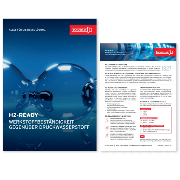 Wasserstoff bleibt ein zentraler Treiber der Energiewende. Seit der TÜV Süd-Zertifizierung für „Werkstoffbeständigkeit gegenüber Druckwasserstoff“ im April 2024 positioniert sich Schoeller aktiv in diesem Bereich. Unsere längsnahtgeschweißten und nachgezogenen Edelstahlrohre erfüllen höchste Anforderungen an Versprödungsresistenz, Temperaturschwankungen und dynamische Belastungen – und sorgen so für Sicherheit und Leistung in Elektrolyse, Brennstoffzellen und Wasserstofftransport.