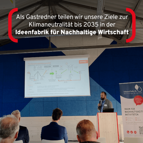 Am 22. November waren wir als Gastredner Teil der „Ideenfabrik für Nachhaltige Wirtschaft“ in der Tuchfabrik Euskirchen zu Besuch. Die Ideenfabrik adressiert Themen und wichtige Entwicklungsherausforderungen wie Innovationsfähigkeit oder Fachkräfteattraktivität im Kreis Euskirchen auf dem Weg einer nachhaltigen Transformation. Unser Leiter Technische Services, Johannes Heun, hat in diesem Rahmen erneut unsere Ziele und Pläne von Klimaneutralität bis 2035 vorgestellt.